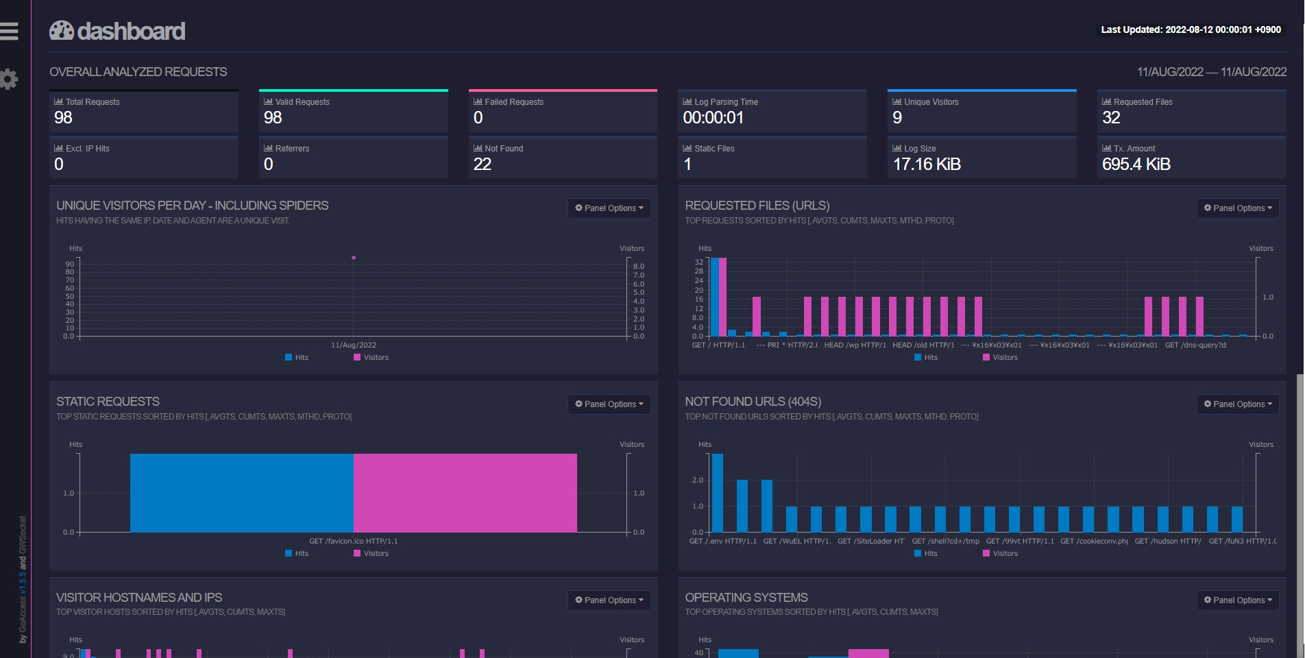 * * * * * root goaccess -f /var/log/nginx/access.log --log-format=COMBINED -o /var/www/html_logview/index.html これで1分毎にアクセスログからHTMLファイルを更新されます。